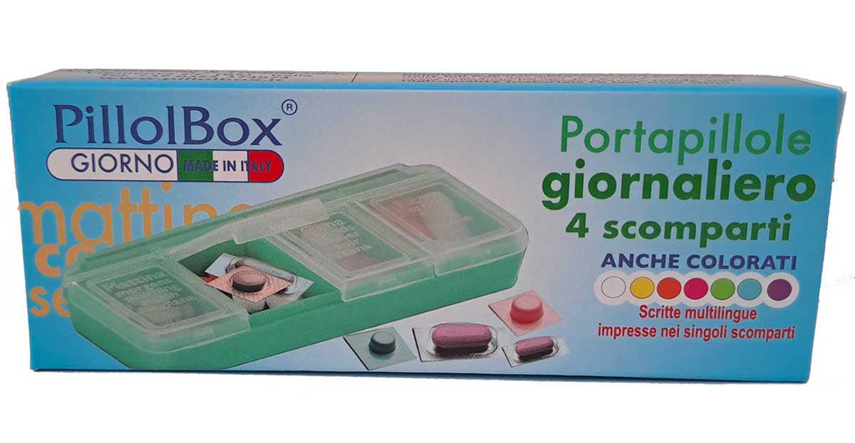 Più pratico, con apertura di ogni singolo scomparto. Le dimensioni dei 4 scomparti permettono di conservare anche farmaci di grandi dimensioni o che devono rimanere blisterati.